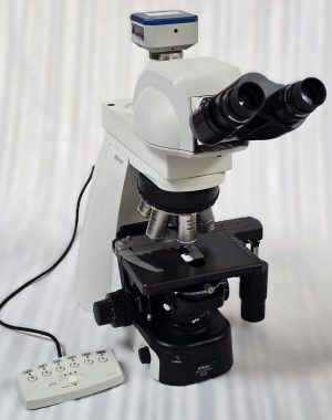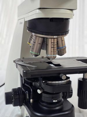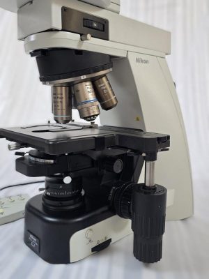 Sehr hochwertiges Nikon Eclipse Ci Durchlichtmikroskop mit Ergotrinokulartubus, Vergrösserungswechsler, LED Beleuchtung, Polarisation, motorischem Objektivwechsel, Komplettbestueckung mit hochwertigen Plan Fluor Objektiven
